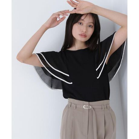 袖の分量をふんだんに取ったフレアスリーブデザインのニットプルオーバー。身頃はコンパクトなシルエットですっきりと、フレアスリーブは落ち感のある楊柳素材を合わせることで、袖の揺れ感がポイント。袖口は配色のパイピング仕様で印象的に見せながらアクセントに。ハイウエストのフレアスカートやナロースカートを合わせたスタイリングがおすすめです。<素材>袖は縦目に表情のある柔らかい楊柳素材を使用。身頃は清涼感のあるタッチの糸を使い、天竺編みで編み立てています。<詳細>仕様・開閉なし裏地・なし透け感・なし / 光沢・なし / 伸縮性・あり生地の厚さ・普通※モデルの着用画像の場合、光の当たり具合により、実際の色味と異なって見えることがございます。色味は、商品単体の画像をご参照ください。