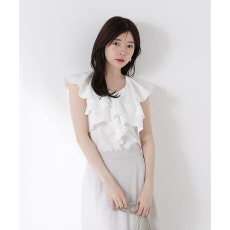 大きいフリルディテールが目を引くキレイめブラウスです。トレンドの縦に流れるようなフリルディテールを入れており、どんなコーディネートも女性らしい雰囲気を演出。スカートやデニムパンツとも着ていただけます。
