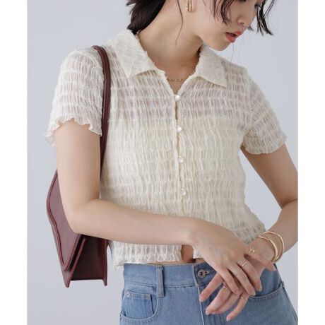 軽やかで意匠感があり、1枚で華やかなスタイリングが作れる半袖ブラウス。シアー素材にチュールフリルをたたき付けた立体感がかわいい素材を使用。フロントの小粒ボタンで着脱できます。ボタンを留めてポロ風に着こなすのがおすすめですが、羽織りとしても活躍できます。コンパクトなシルエットなのでワイドパンツやデニムと合わせ、メリハリを付けたコーディネートがおすすめ!ミニボトムを合わせるとヘルシーな着こなしも楽しめます。※モデルの着用画像の場合、光の当たり具合により、実際の色味と異なって見えることがございます。色味は、商品単体の画像をご参照ください。