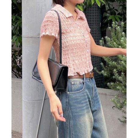 軽やかで意匠感があり、1枚で華やかなスタイリングが作れる半袖ブラウス。シアー素材にチュールフリルをたたき付けた立体感がかわいい素材を使用。フロントの小粒ボタンで着脱できます。ボタンを留めてポロ風に着こなすのがおすすめですが、羽織りとしても活躍できます。コンパクトなシルエットなのでワイドパンツやデニムと合わせ、メリハリを付けたコーディネートがおすすめ!ミニボトムを合わせるとヘルシーな着こなしも楽しめます。※モデルの着用画像の場合、光の当たり具合により、実際の色味と異なって見えることがございます。色味は、商品単体の画像をご参照ください。