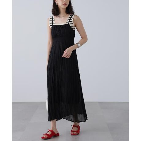 光沢のあるシアー素材にクリンクル加工を施したキャミワンピース。透け防止の裏地がついているので安心して着用いただけます。フロントの飾りボタンをポイントに、ウエスト部分はシャーリングゴムで程よくフィットしながら、スタイルアップを叶えます。スカート部分は広がりすぎない程よいフレアシルエットを演出。カップ付きインナーの上に1枚で着るのはもちろん、Tシャツにキャップ、足元はスニーカー合わせでカジュアルな着こなしもおすすめです。※モデルの着用画像の場合、光の当たり具合により、実際の色味と異なって見えることがございます。色味は、商品単体の画像をご参照ください。