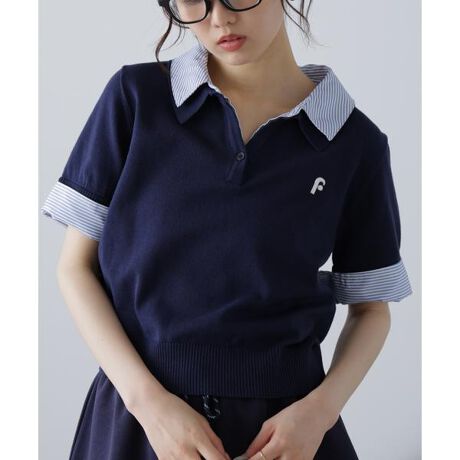 綿タッチのニットポロにシャツをレイヤードしたようなドッキングデザイントップス。トレンドのレイヤードスタイリングが1枚着るだけで完成します。左胸にはブランドロゴの頭文字を取った「F」刺しゅう入りでプレッピーな雰囲気に。グレーには無地サックスシャツ、ネイビーにはサックスストライプシャツ合わせで雰囲気の違うカラー展開です。ミニスカート合わせでヘルシーなプレッピースタイリングが今年らしくておすすめ。袖のカフスは伸ばしたままでも折り返しても着ていただけます。※モデルの着用画像の場合、光の当たり具合により、実際の色味と異なって見えることがございます。色味は、商品単体の画像をご参照ください。