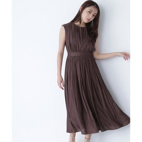 落ち感と揺れ感のある割繊サテン素材にギャザーをふんだんに寄せたデザインがポイントのワンピース。襟ぐりから肩先にかけてギャザーを寄せて、上品で華やかな印象に仕上げています。ウエストはベルト切り替えを入れ、後ろはゴム仕様できちんと見えしつつ、着脱しやすさと程よいフィット感でストレスフリーな着心地。オフィスやオケージョンシーンにも活躍します。<素材>落ち感と揺れ感のある、程よい光沢感の割繊サテン素材を使用しています。柔らかな素材感です。<詳細>仕様・後ろボタン裏地・あり透け感・なし / 光沢・ややあり / 伸縮性・なし生地の厚さ・薄手※モデルの着用画像の場合、光の当たり具合により、実際の色味と異なって見えることがございます。色味は、商品単体の画像をご参照ください。