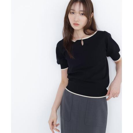襟ぐりのTバーメタルホックをアクセントに効かせた、キレイめニットプルオーバー。襟と袖口に華奢なバイカラーデザインを入れ、袖はほんのり膨らみのあるフォルムで女性らしさを演出します。スカートもパンツも合わせやすく、デイリーからオフィスシーンにも着ていただけます。<素材>サラッとした肌触りで目面のキレイなニットを使用。フロントにデザインポイントでホックが付いていますが、ホックを開けなくても被りで着ていただけます。<詳細>仕様・開閉なし裏地・なし透け感・なし / 光沢・なし / 伸縮性・あり生地の厚さ・普通※モデルの着用画像の場合、光の当たり具合により、実際の色味と異なって見えることがございます。色味は、商品単体の画像をご参照ください。