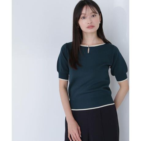 襟ぐりのTバーメタルホックをアクセントに効かせた、キレイめニットプルオーバー。襟と袖口に華奢なバイカラーデザインを入れ、袖はほんのり膨らみのあるフォルムで女性らしさを演出します。スカートもパンツも合わせやすく、デイリーからオフィスシーンにも着ていただけます。<素材>サラッとした肌触りで目面のキレイなニットを使用。フロントにデザインポイントでホックが付いていますが、ホックを開けなくても被りで着ていただけます。<詳細>仕様・開閉なし裏地・なし透け感・なし / 光沢・なし / 伸縮性・あり生地の厚さ・普通※モデルの着用画像の場合、光の当たり具合により、実際の色味と異なって見えることがございます。色味は、商品単体の画像をご参照ください。