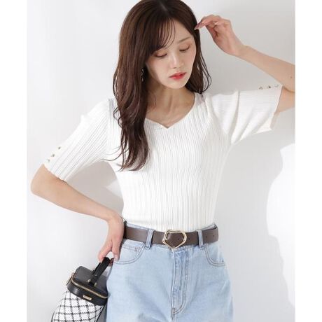 女性らしさを演出してくれるハートネックのリブニットです。袖はきらっと光るボタンを並べており、シンプルながらも華やかさを演出。合わせるボトムス次第でON・OFF問わず着ていただけます。