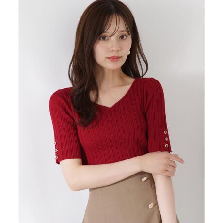 女性らしさを演出してくれるハートネックのリブニットです。袖はきらっと光るボタンを並べており、シンプルながらも華やかさを演出。合わせるボトムス次第でON・OFF問わず着ていただけます。