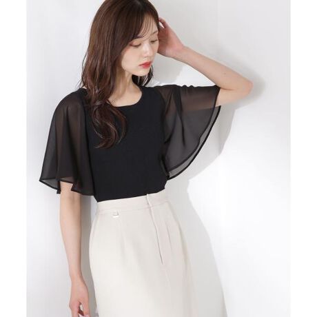 袖に繊細なシフォンスリーブを取り入れたリブニットです。シンプルなデザインながら、色のトーンを揃えた異素材コンビが女性らしく上品な印象に。二の腕をカバーする長めの袖丈なので、デイリーに着こなしやすいアイテムです。