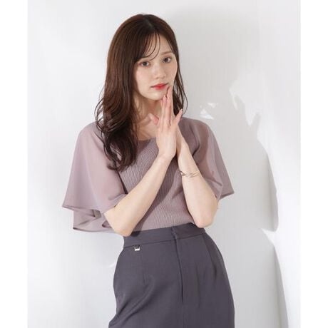 袖に繊細なシフォンスリーブを取り入れたリブニットです。シンプルなデザインながら、色のトーンを揃えた異素材コンビが女性らしく上品な印象に。二の腕をカバーする長めの袖丈なので、デイリーに着こなしやすいアイテムです。