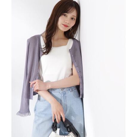 涼やかに縦見えする柄編みカーディガンです。袖口に付けたシアー素材のフリルとスリットが愛らしいポイント。インナーはキャミソールやタンクトップ合わせで、プルオーバー風に着ていただけます。