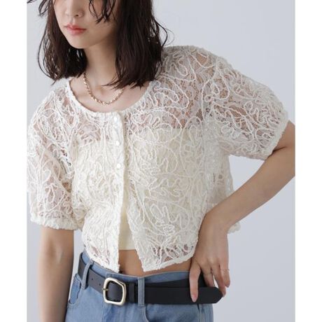 レース地にコード刺しゅうをあしらった華やかな印象のブラウス。程よい透け感がありヘルシーな雰囲気で合わせられます。これからのシーズン軽く羽織ったり、前後どちらを前にしても着られる2wayデザイン。デニムやスウェット、バレルタックパンツと合わせたカジュアルな着こなしから、キャミワンピースなどのキレイめなコーディネートにも着回せます。※モデルの着用画像の場合、光の当たり具合により、実際の色味と異なって見えることがございます。色味は、商品単体の画像をご参照ください。