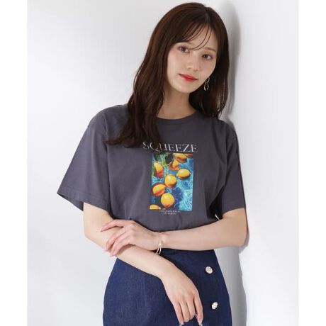 夏を感じさせるレモンプリントがキャッチーなTシャツです。襟ぐりが詰まりすぎないのも嬉しいポイント。オーバーサイズなのでフェミニンなスカート合わせが相性バツグンです。