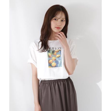 夏を感じさせるレモンプリントがキャッチーなTシャツです。襟ぐりが詰まりすぎないのも嬉しいポイント。オーバーサイズなのでフェミニンなスカート合わせが相性バツグンです。