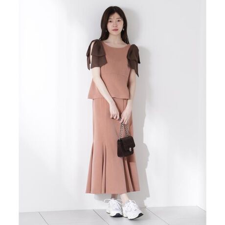 異素材のショルダーリボンがオトナ可愛いセットアップです。ペプラムブラウスとマーメイドスカートの組み合わせが女性らしいデザインで、スタイル良く見せてくれます。SETUPスタイルはもちろん、別々でも着回せるのでコーディネートの幅が広がります。
