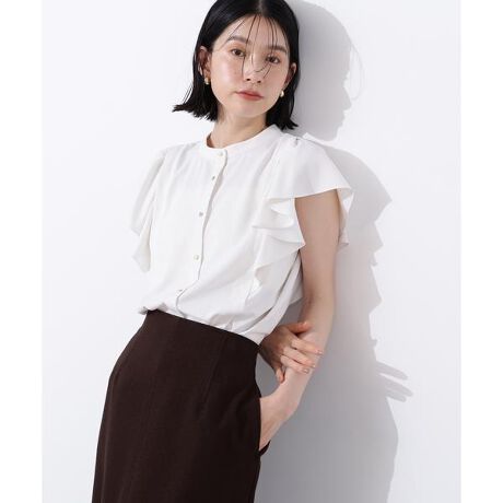 フロントのメタル釦がきらっとポイントのブラウスです。袖は華やかなフリルスリーブが女性らしく、二の腕もカバー。襟はバンドカラーできちんと感もあるので、キレイめスカートやパンツ合わせでONスタイルはもちろん、デニム合わせでOFFスタイルにも着こなせます。<素材>肌触りが心地よい合繊素材を使用。ジョーゼットの表面が上品なトロミ素材でシワになりにくく扱いやすい素材です。<詳細>仕様・前ボタン裏地・なし透け感・ややあり / 光沢・なし / 伸縮性・なし生地の厚さ・普通※モデルの着用画像の場合、光の当たり具合により、実際の色味と異なって見えることがございます。色味は、商品単体の画像をご参照ください。