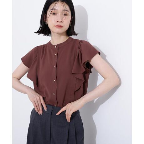 フロントのメタル釦がきらっとポイントのブラウスです。袖は華やかなフリルスリーブが女性らしく、二の腕もカバー。襟はバンドカラーできちんと感もあるので、キレイめスカートやパンツ合わせでONスタイルはもちろん、デニム合わせでOFFスタイルにも着こなせます。<素材>肌触りが心地よい合繊素材を使用。ジョーゼットの表面が上品なトロミ素材でシワになりにくく扱いやすい素材です。<詳細>仕様・前ボタン裏地・なし透け感・ややあり / 光沢・なし / 伸縮性・なし生地の厚さ・普通※モデルの着用画像の場合、光の当たり具合により、実際の色味と異なって見えることがございます。色味は、商品単体の画像をご参照ください。