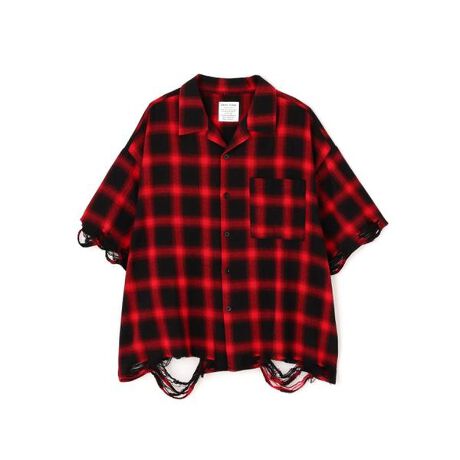 袖と裾にほどこしたダメージ加工がアクセントになっている半袖チェックシャツ。