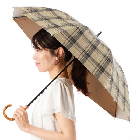 バンブーの持ち手と先染めの糸で織りあげた美しい発色のチェック柄がクラシカルな佇まいの晴雨兼用傘。表生地と調和する裏面カラーコーティングが洗練されたスタイルを完成させます。一級遮光生地を使用し、機能性も充実。タイムレスなデザインは幅広いシーンで活躍します。