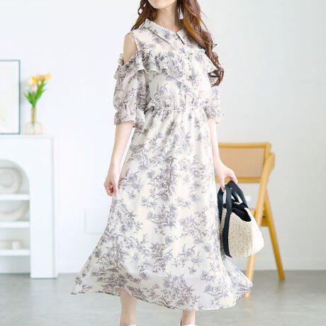 肩開きデザインが特徴の花柄ワンピースです。オープンショルダーのデザインは上品でありながら女性らしさを引き立てます。ウエストはゴム仕様で快適にフィットし、ウエストラインを美しく演出してくれます。袖はキャンディー袖で気になる部分をさりげなくカバーしつつ可愛らしいアクセントを添えます。胸元のフリルは顔周りを明るく見せてくれます。洗練されたカラーと花柄は派手すぎない大人の柄で、どんな年代の方にもマッチ。気軽なお出かけから特別なイベントまで幅広く活躍する一着です。