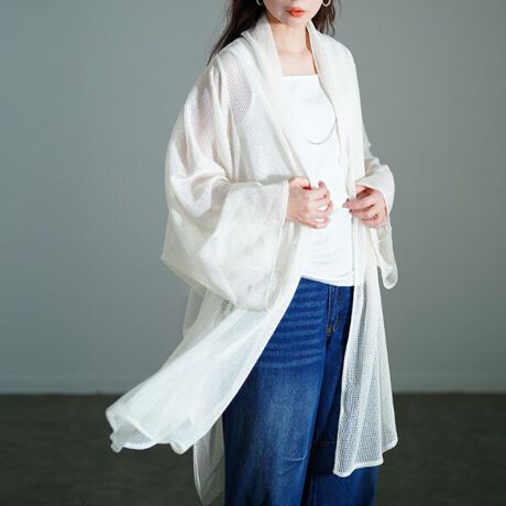 透け感を楽しむメッシュロングカーディガン。サッと気軽に羽織れるトッパーデザインにシアーなメッシュ素材でトレンド感アップ!洋服や肌とのコントラストが映えて、簡単にお洒落な印象◎ゆったりと羽織れるリラクシーなシルエットはインを選ばず、こなれた雰囲気に。透け感とキレイな落ち感がスッキリ見せてくれます。柔らかく肌触りの良いメッシュ生地は風を通し、涼しく着用いただけます。