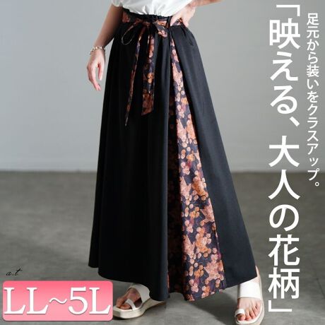 大人の女性らしさ高める、サイド花柄ロングスカート。一見シンプルな無地のようで、実はシックな花柄に切り替えスリット落ち着いた色合いの花模様が大人の華やかさを演出します。共布リボンベルト付きでメリハリをオンでき、スタイルアップ効果◎たっぷりとった用尺でしっかりドレープを生み下半身カバーし、穿いたときにキレイな落ち感の広がりすぎないシルエット。いつものコーデをクラスアップしてくれるアイテムです。