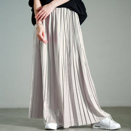 女度がグッと上がる艶やかなサテンプリーツスカートの登場です♪通年多様なシーンで着まわせる〈ぽっちゃりさんマストバイの一着〉足首にかかるロング丈で、気になる腰まわりから脚のラインまで抜かりなくカバーし、プリーツの縦ラインアピールで脚長&スタイルアップ効果も抜群です☆