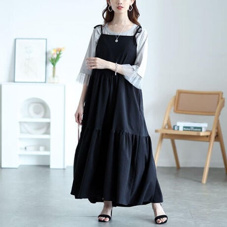 【大きいサイズ】 肩リボンティアードキャミワンピース 大きいサイズ レディース ワンピース ロング