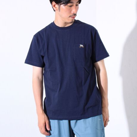 ・シンプルなポケットTシャツに、さりげない“フレンチブルドッグ刺繍”がアクセント。