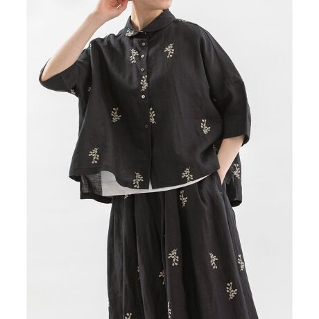 ユーカリモチーフ刺繍のオリジナルテキスタイルの5分袖シャツ。適度な張りとさらっとした清涼感のあるラミーを使用。ワイドな身幅で、脇が垂れるこなれ感のあるシルエット。小さな丸襟が上品です。上の方のボタン間隔が狭く、ボタンの開け具合の調整ができます。開けた時にちらりと見える配色ステッチもポイント。