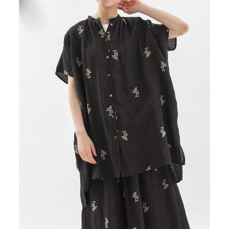 ユーカリモチーフ刺繍のオリジナルテキスタイルのチュニックシャツ。適度な張りとさらっとした清涼感のあるラミーを使用。ワイドな分量感でサイドが垂れる動きのあるシルエットがこなれ感を演出。上の方のボタン間隔が狭く、ボタンの開け具合の調整ができます。開けた時にちらりと見える配色ステッチや、大きな前後差のあるデザインもポイント。サイドにはスカラップステッチ入りのポケットがついています。