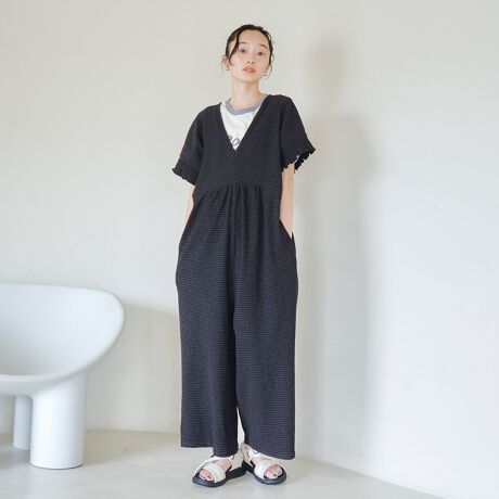 涼しげなサッカーチェック素材を使用した、これからの季節にぴったりのオールインワン。