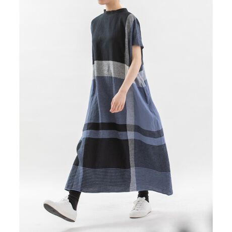 リネン100%のオリジナルパネルチェックテキスタイルのワンピース。身頃から続く半袖で、首からやや離れたボトルネックで前後両面どちらを前にしても着用できる2way仕様です。両サイドポケットつき。