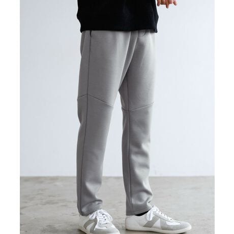 空気を含んだような膨らみと適度なハリを持つハイポンチ生地を採用。生地の密度が高いため一般的なスウェットなどと比べてもへたりにくく、着用時の脚のラインが美しく作り出されます。