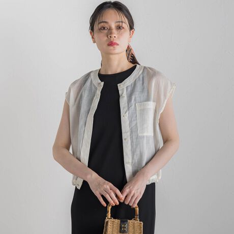 ブラウスとしてはもちろん、フロントのボタンを開ければジレの様にも羽織れて着回しの効く1枚です。