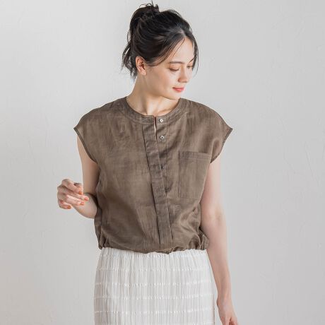 シャリ感とほんのりシアーなリネンならではの表情がニュアンス感のあるブラウス。