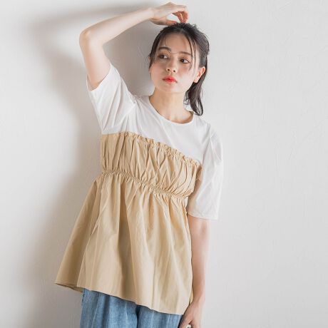 1枚着るだけでビスチェをレイヤードした様なスタイルが決まるドッキングタイプのカットソー。