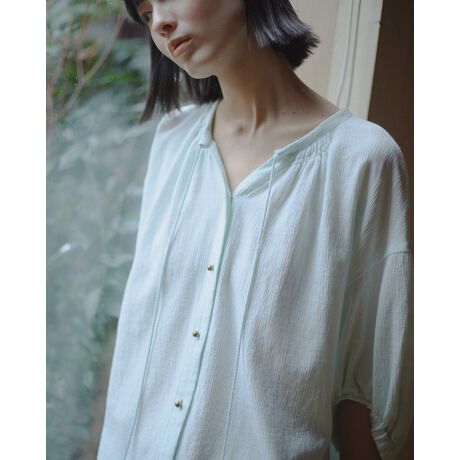 変わり織で縦目にシボ感があり、肌あたりがサラッとしている、アイロン入らずのブラウスです。