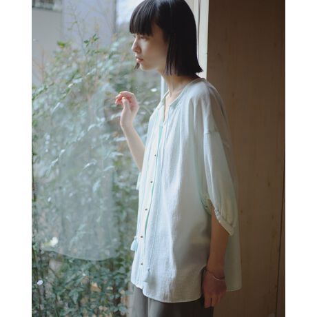 ゆったりした袖の作り、ネックはタッセル付きのリボン付き。
