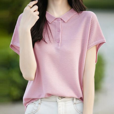 シンプルながらもエレガント!襟付きのデザインがチャームポイントの半袖サマーニットカットソーが新登場!