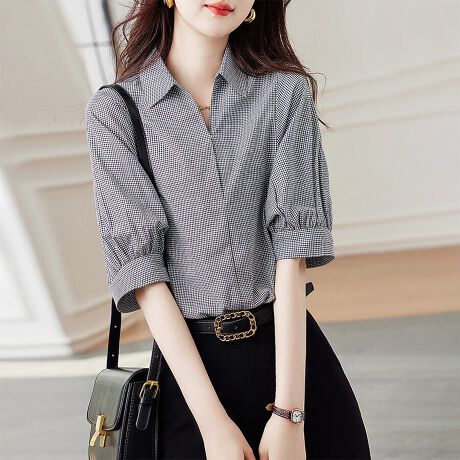 5分袖チェック柄パフスリーブブラウス