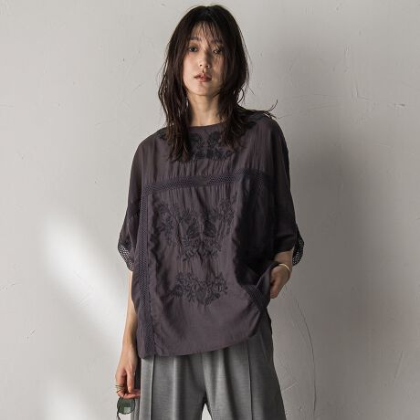 ボタニカル刺繍をたっぷりほどこした、ドルマンブラウス。