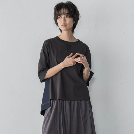 なめらかな肌触りが魅力の綿100%カットソーと、薄手の綿デニム地を組み合わせて洗い加工を入れ、こなれたムードを表現。