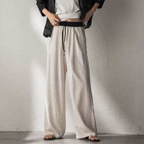 異素材の配色ベルトがスタイリングを引き締めてくれる、リネン・ワイドパンツ。