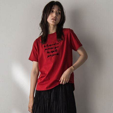 立体的なブラシ刺繍のメッセージがキャッチーな、クルーネック・Tシャツ。