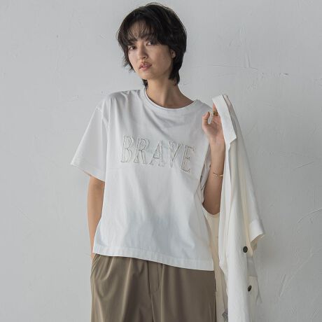 カジュアルなロゴTシャツは、ジャケットやスカート、少しきれいめスタイリングの?外し”使いがおすすめ。