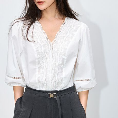 女性らしい美しさを演出する深めのVネックとゆったりとした袖感でエレガントながらもメリハリのある上品なシャツブラウスが新登場!