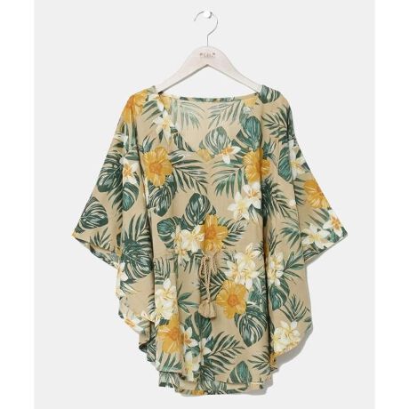 [型番:4IA-5230-2025]鮮やかなカラーリングのUVカット機能付きのトップス。大きめのハイビスカスやモンステラ、ラメプリントがポイント。ウエストの紐でサイズ感が調整可能です。UVカット加工