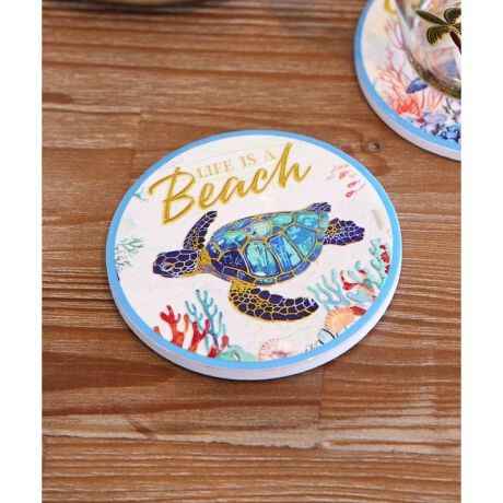 [型番:49RP5201-2025]ハワイの美しい海の風景が描かれた陶器のコースター。インテリアとして飾りたくなるほどの美しさ。ゴールドの文字やデザインがきれいに輝きます。