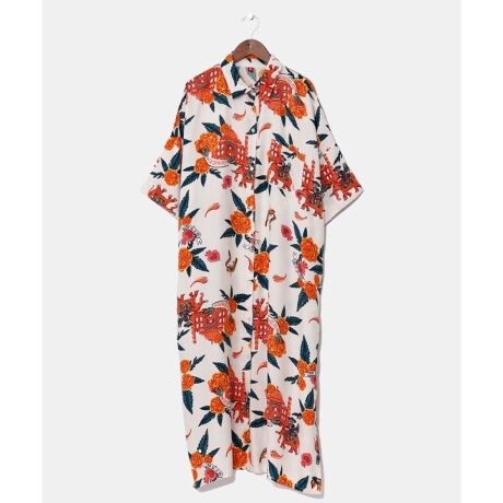 メキシコとインドのモチーフが融合した2WAYタイプの着用が出来るワンピース。旅するカラベラがゾウに乗ってインドへ訪問。神聖な意味を持つマリーゴールドはインドとメキシコには欠かせない花です。アロハ柄、花柄に挑戦してみたい方へおすすめ。裾のスリットで着やすさアップ。さらっと着られて涼しいレーヨン素材。