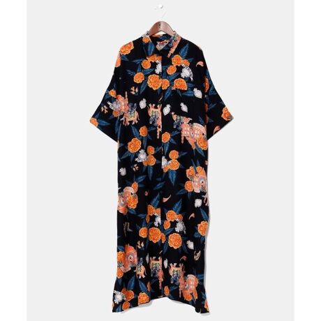 メキシコとインドのモチーフが融合した2WAYタイプの着用が出来るワンピース。旅するカラベラがゾウに乗ってインドへ訪問。神聖な意味を持つマリーゴールドはインドとメキシコには欠かせない花です。アロハ柄、花柄に挑戦してみたい方へおすすめ。裾のスリットで着やすさアップ。さらっと着られて涼しいレーヨン素材。